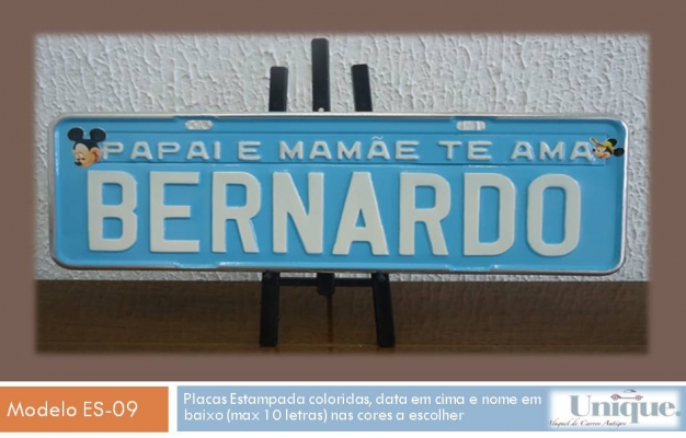 Placa de alumínio, estampada com data ou mensagem na parte superior (targeta) e nome na linha inferior (max 10 letras), pode ser feita em várias cores de letra e fundo.